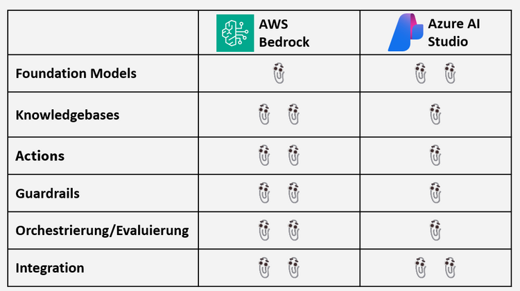 Sowohl AWS Bedrock als auch Azure AI Studio sind leistungsfähige Plattformen, die es ermöglichen, KI-gestützte Anwendungen und speziell Agenten schnell und systematisch zu entwickeln und skalierbar einzusetzen. Azure bietet einen hervorragenden Zugang zu Basismodellen mit ausgefeilten Guardrails und integriert sich nahtlos in die Azure-Cloud und andere Microsoft-Umgebungen. AWS Bedrock hingegen zeichnet sich durch eine besser entwickelte Integration von Funktionen und Wissensdatenbanken für Agenten aus und bietet individuell konfigurierbare Orchestrierung und fortschrittliche Guardrails. Insgesamt sind beide Services auf dem neuesten Stand der Technik und eignen sich hervorragend zur Entwicklung von Enterprise-KI-Produkten. Beide Plattformen entwickeln sich schnell weiter, was eine genaue Beobachtung beider Anbieter weiterhin spannend macht.